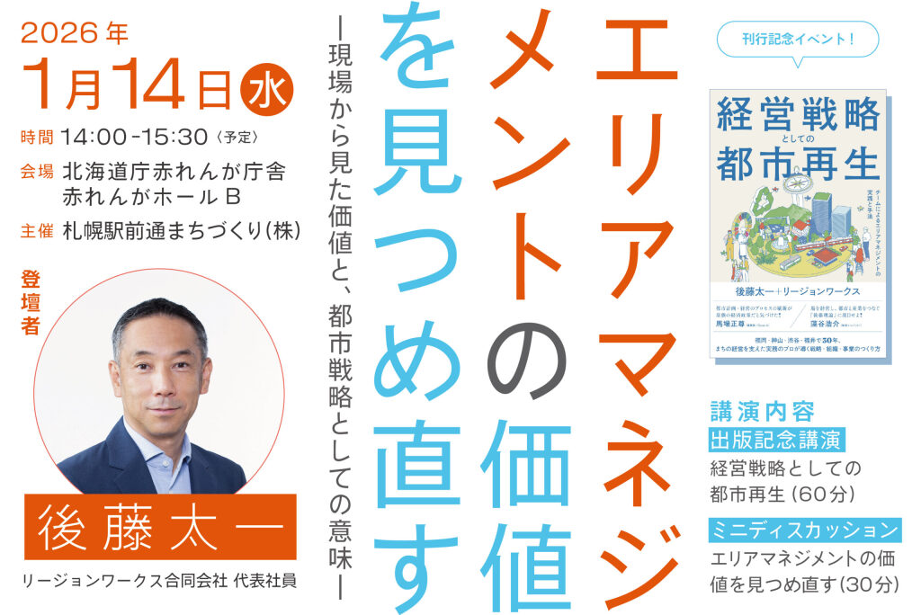 今回お招きするのは、『経営戦略としての都市再生 — チームによるエリアマネジメントの実践と手法』を出版された後藤太一さん(リージョンワークス合同会社代表社員)。