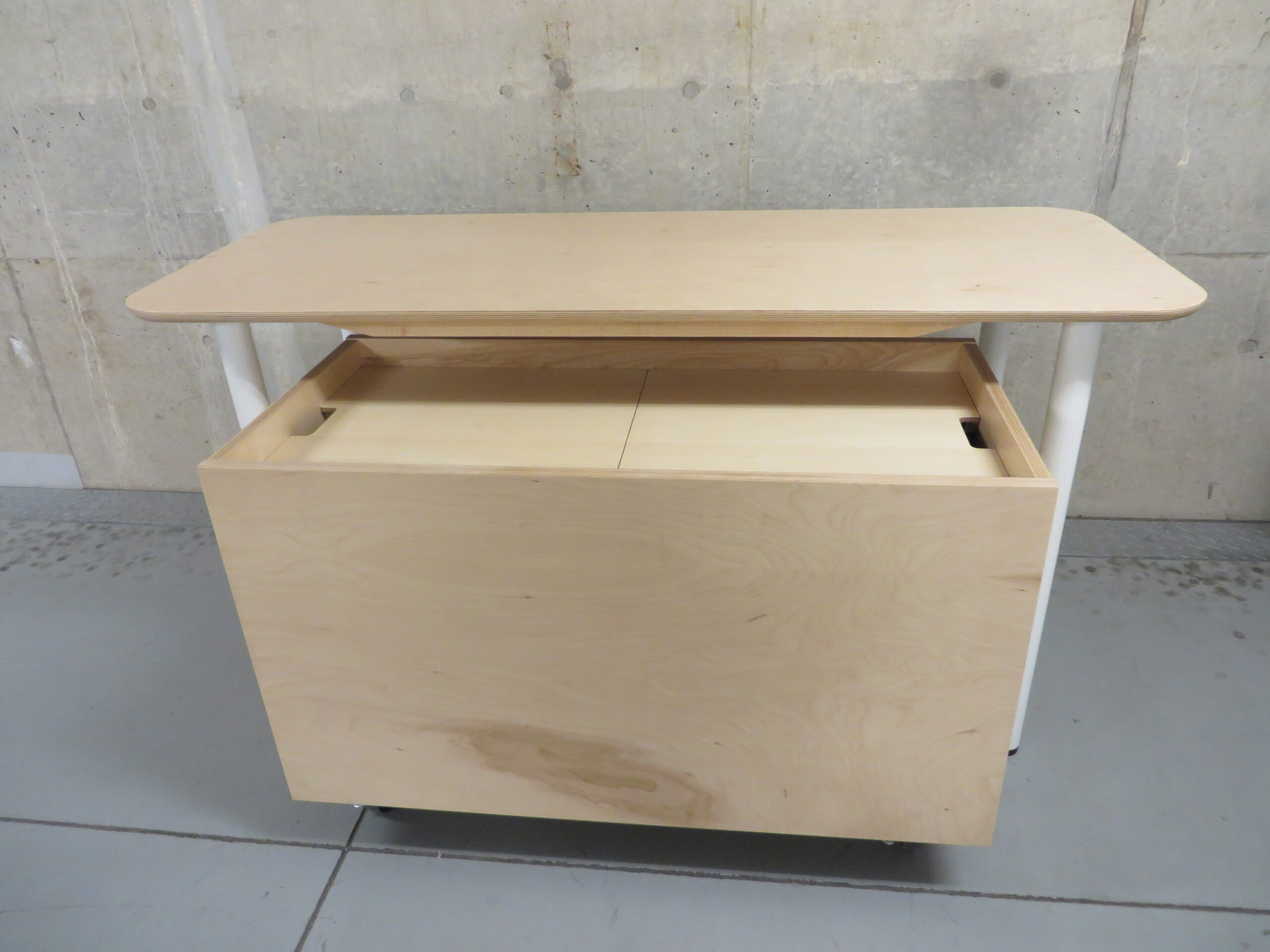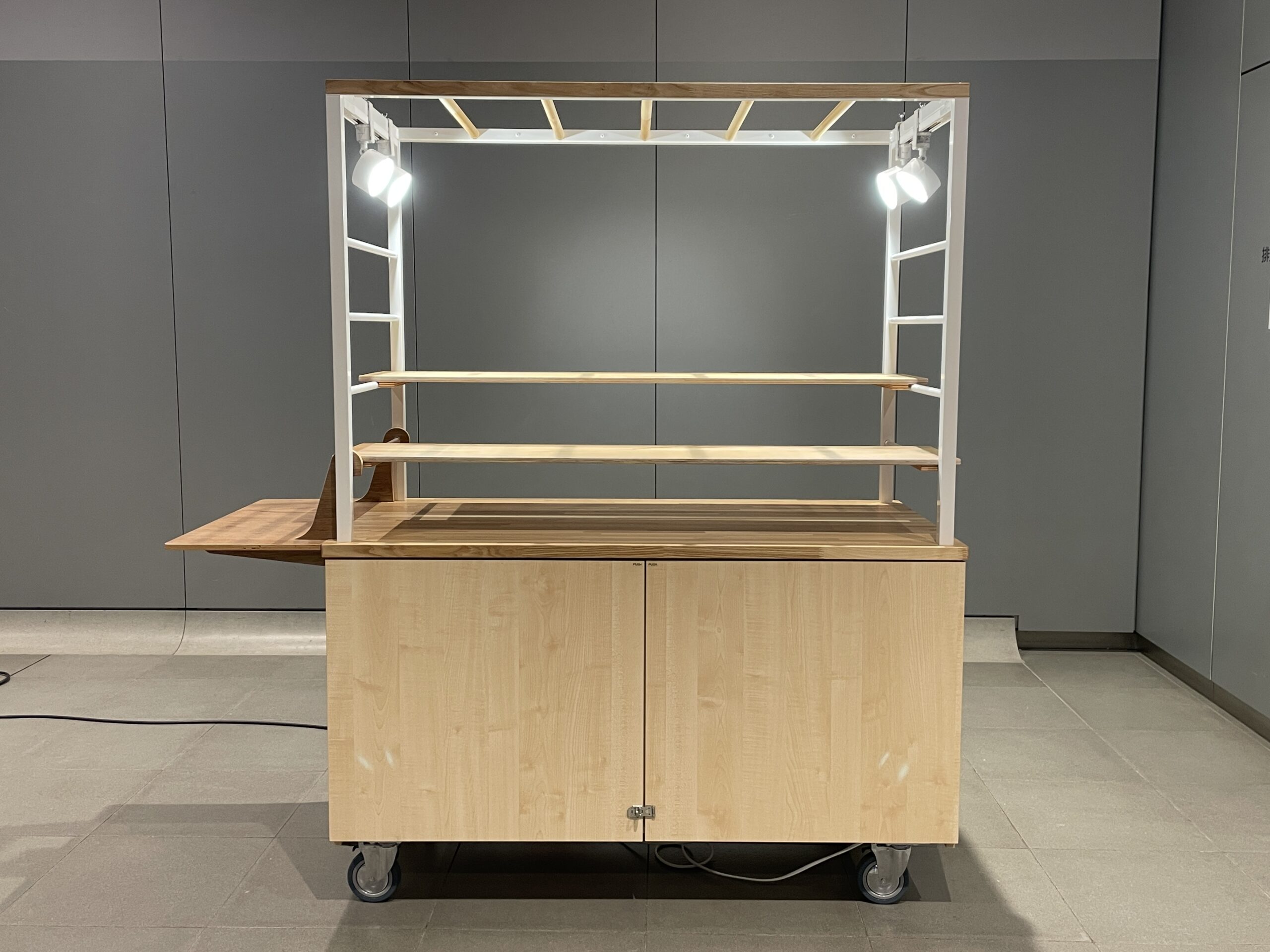 一番苦労したのは、脚の部分です。必要に応じて脚部分が伸縮できるようにしたかったものの、機能上の問題で断念。しかしこの時の試作品をもとに、BOXの高さの変更や蓋をつけ展示台としての利用も検討され、1年後に新たなカウンターが無事完成しました。白樺の素材を使っていることから、名前は「バーチカウンター」と名付けられました。 -
