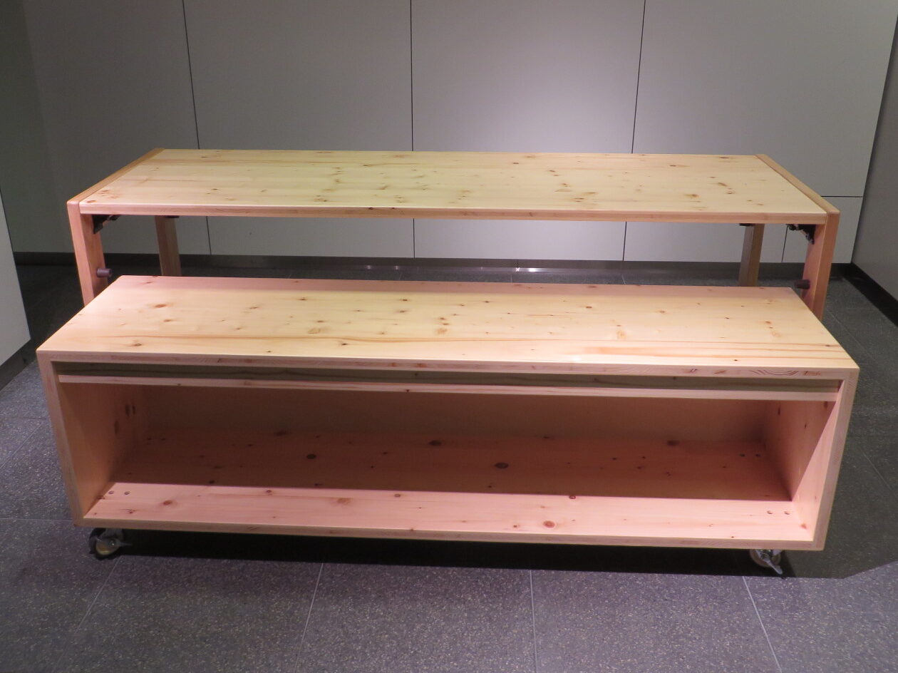 チ・カ・ホの運営課題として、展示デザインの向上があげられていました。そこで、チ・カ・ホ2周年フォーラムのゲストにお招きしたデザイナー小泉誠さんに、現地を見ていただいた上でデザインを依頼。制作にあたっては、当社からは「運びやすく使いやすいこと」という運営側の視点を伝え、小泉さんからは「北海道産の木材を使う」というコンセプトが打ち出されました。こだわりの逸品が完成したのは約半年後のこと。北海道産のトドマツを素材にしていることから、テーブルは「トドイタ」、収納兼展示台は「トドバコ」と小泉さんが命名しました。