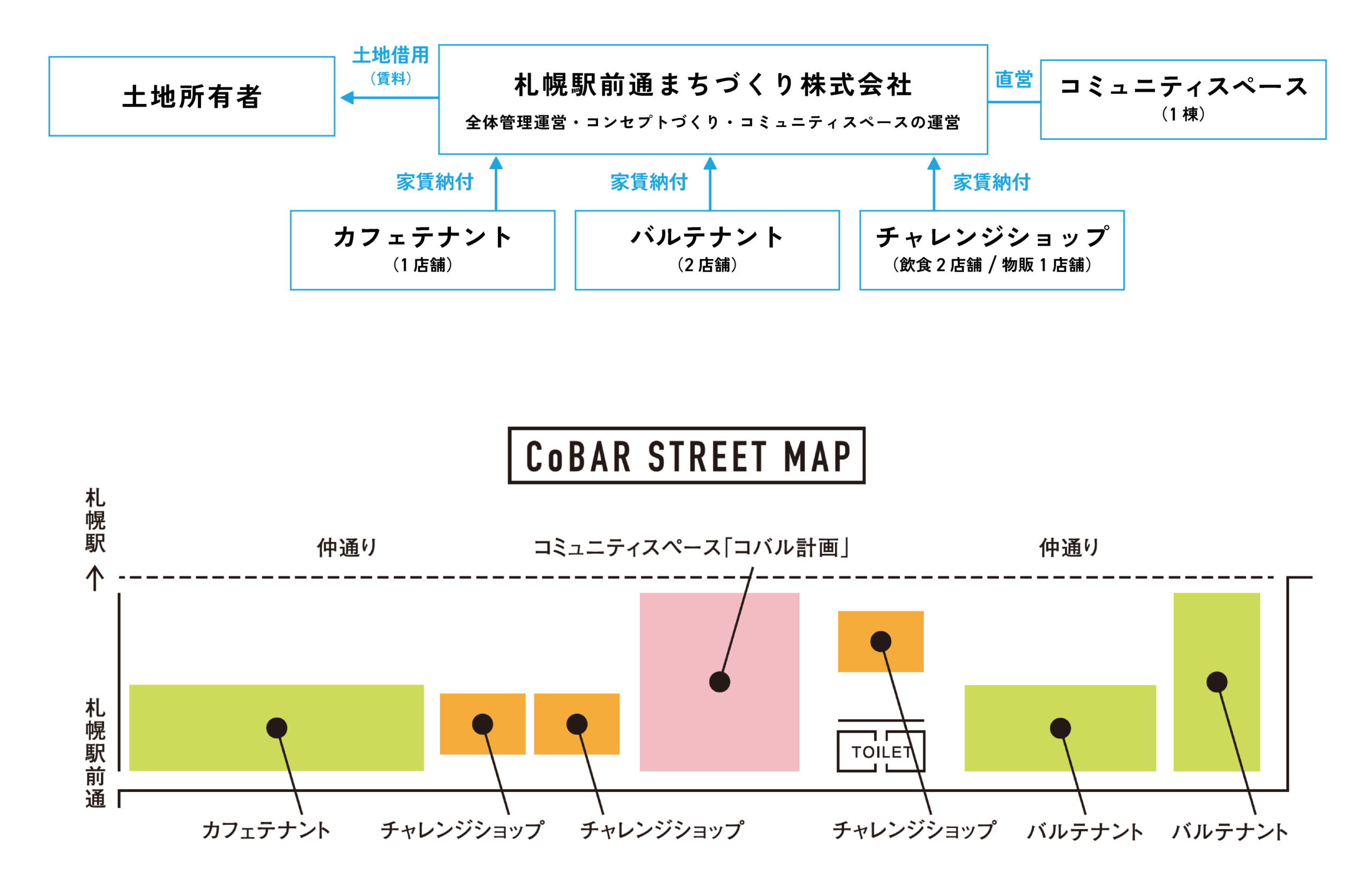 メインストリートと交差する仲通りは、古くから商売をする人や地元で活躍する小さな店舗などが連なり、まちの表情を映し出す地域の象徴ともいえます。札幌駅前通地下歩行空間(チ・カ・ホ)の開通を契機として新たな開発が行われ札幌駅前通の賑わいは目覚ましいものがある一方で、仲通りは独自の可能性を秘めていると考え、再開発による遊休地の活用も含めた「コバルドオリ」のプロジェクトがスタートしました。コバルドオリでは、仲通りの魅力発信のため、地場の事業者や若手の起業家による飲食店舗のほか、都心部において店舗を構えていきたい事業者に向け、安価で出店できるチャレンジショップを開設。また、イベント等も実施できるコミュニティースペース「コバル計画」も開設し、まちを面白くするプレイヤーがつながりあう交流の場として1年10ヶ月営業いたしました。